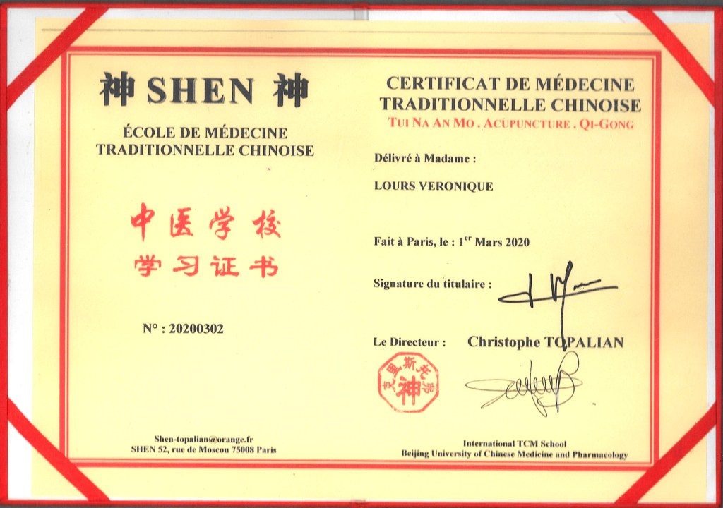 Praticienne de Médecine Traditionnelle Chinoise et de Qi Gong Thérapeutique, formée à l’École Shen accréditée par l’UMTC* de Pékin et le WFAS. ( Université de Medecine traditionnelle de Pékin et le World Federation of Acupuncture and Moxibustion Society)
